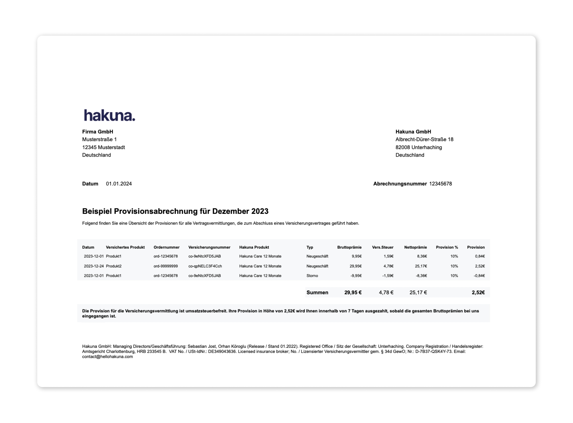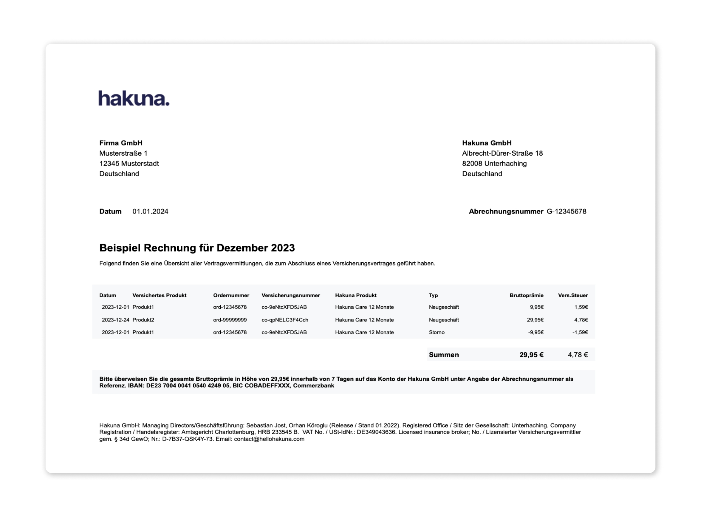 Wir empfehlen, die eingenommenen Bruttoprämien auf ein Unterkonto oder ein separates Verrechnungskonto zu buchen. Am Ende jeder monatlichen Abrechnungsperiode erhältst du von uns einen Abrechnungsbeleg über die erfolgreich abgeschlossenen Verträge. Du musst dann die eingenommenen Bruttoprämien an Hakuna überweisen. Wir werden dann die Versicherungssteuer abführen und die Risikoprämie an den Rückversicherer überweisen, bevor wir dir deine Provision auszahlen, einschließlich des Betrages, der auf die von Hakuna eingenommenen Prämien entfällt. Für die Provisionszahlung erhältst du von Hakuna eine Provisionsabrechnung.