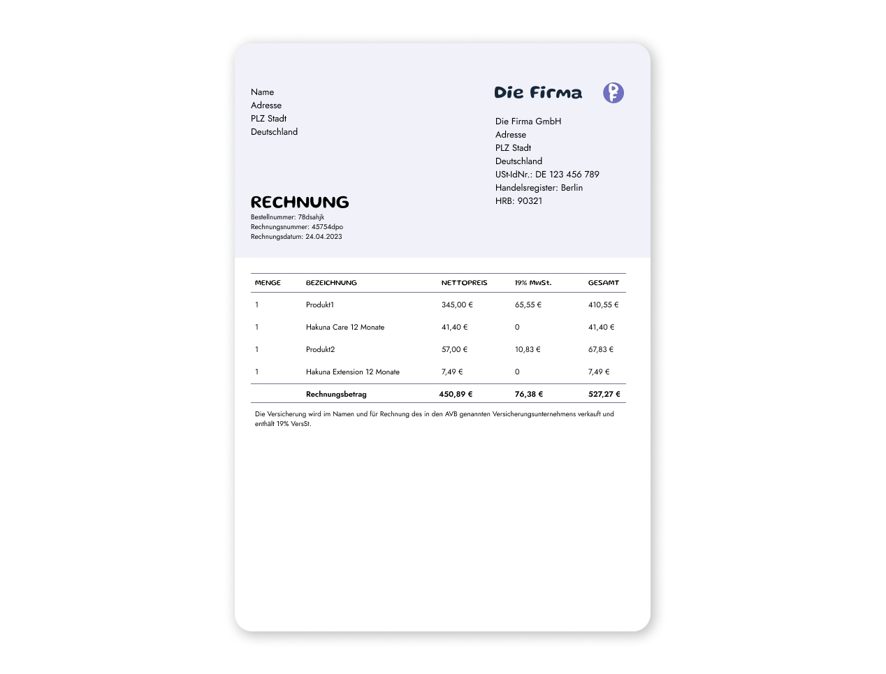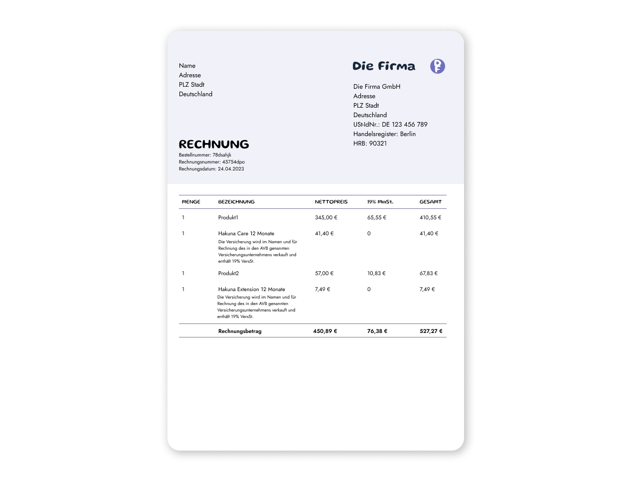 Der Hakuna Produktschutz ist von der Mehrwertsteuer befreit, da in den Bruttoprämien die vorgeschriebene Versicherungsprämiensteuer (19% in Deutschland) enthalten ist. Es gibt zwei Möglichkeiten, dies in den Kundenrechnungen zu handhaben: