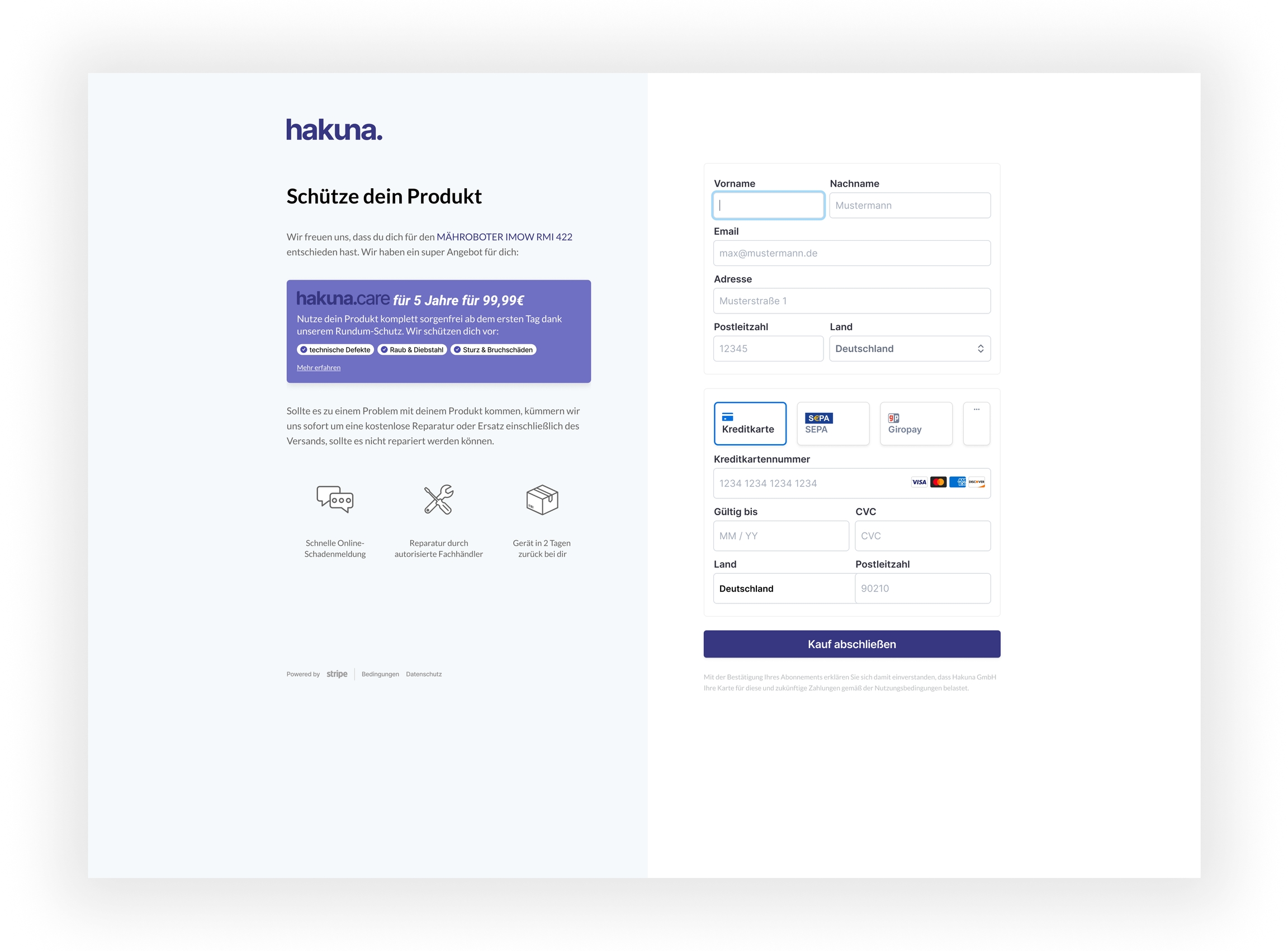 Bei Verwendung des Links wird der Kunde zum Checkout weitergeleitet, wo er den passenden Produktschutz präsentiert bekommt, und seine Zahlungsinformationen eingeben kann, um den Produktschutz für sein Produkt zu erwerben. Sobald dies geschehen ist, senden wir dem Kunden eine E-Mail zur Bestätigung seines Kaufs.
