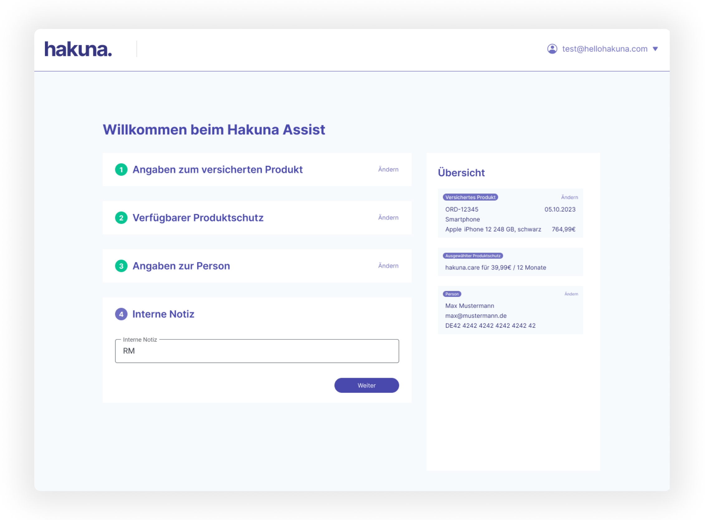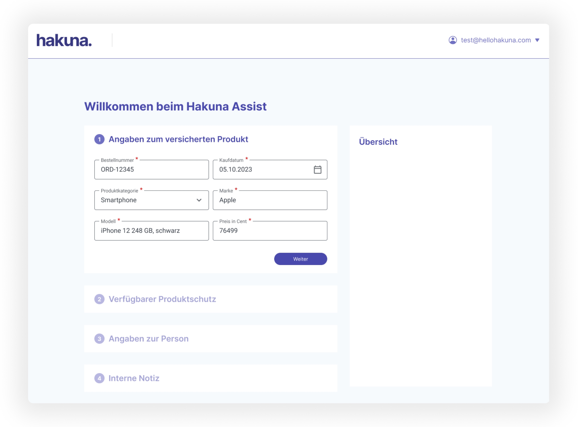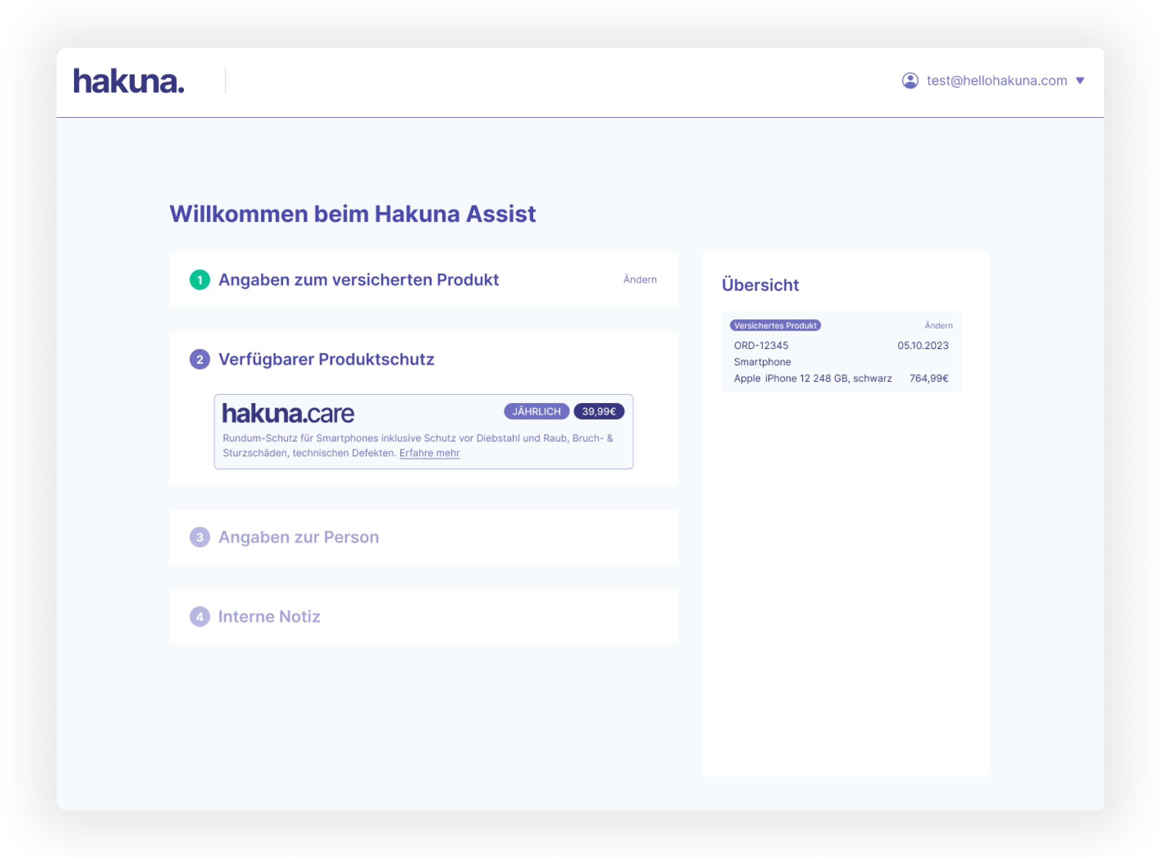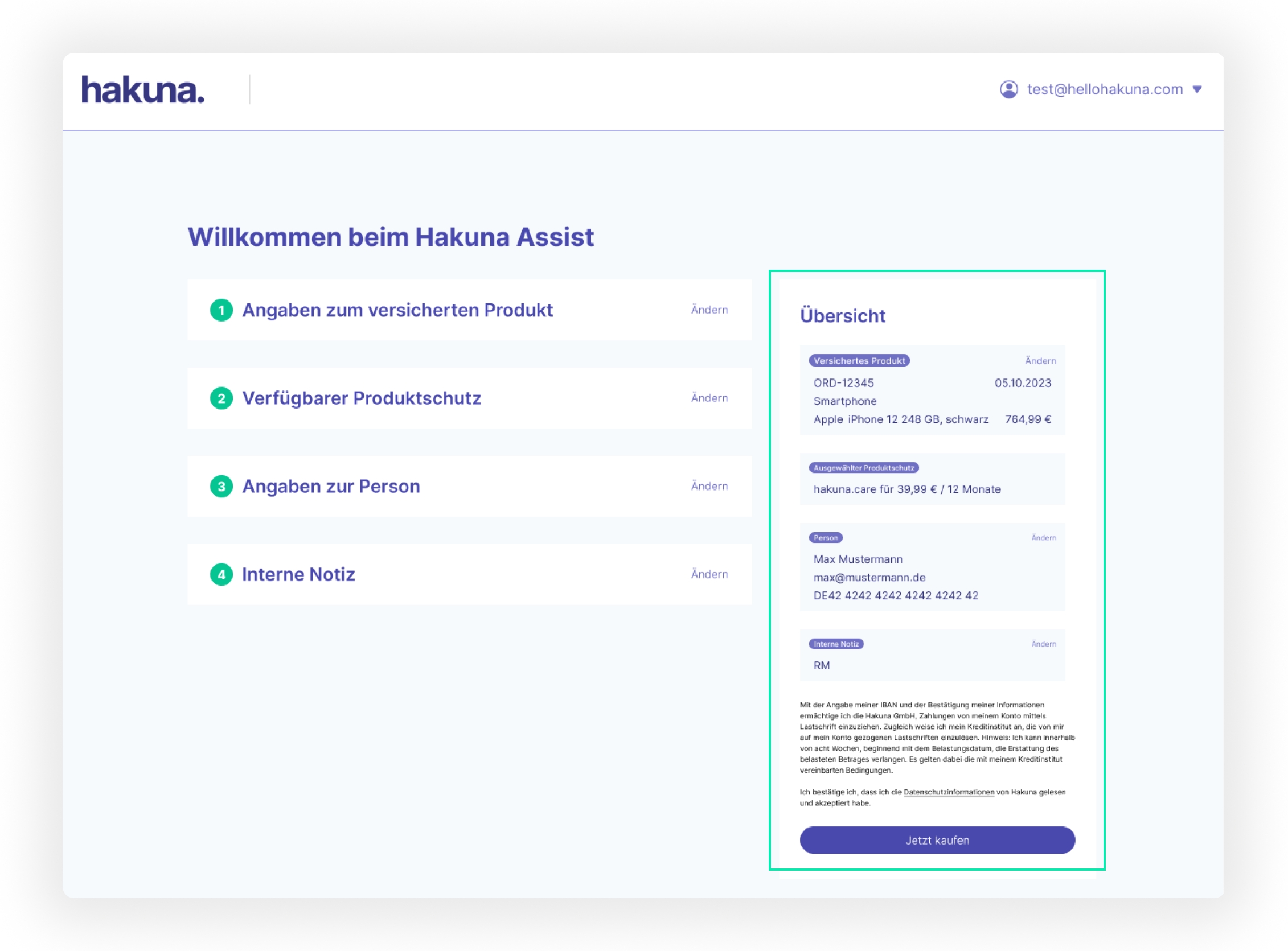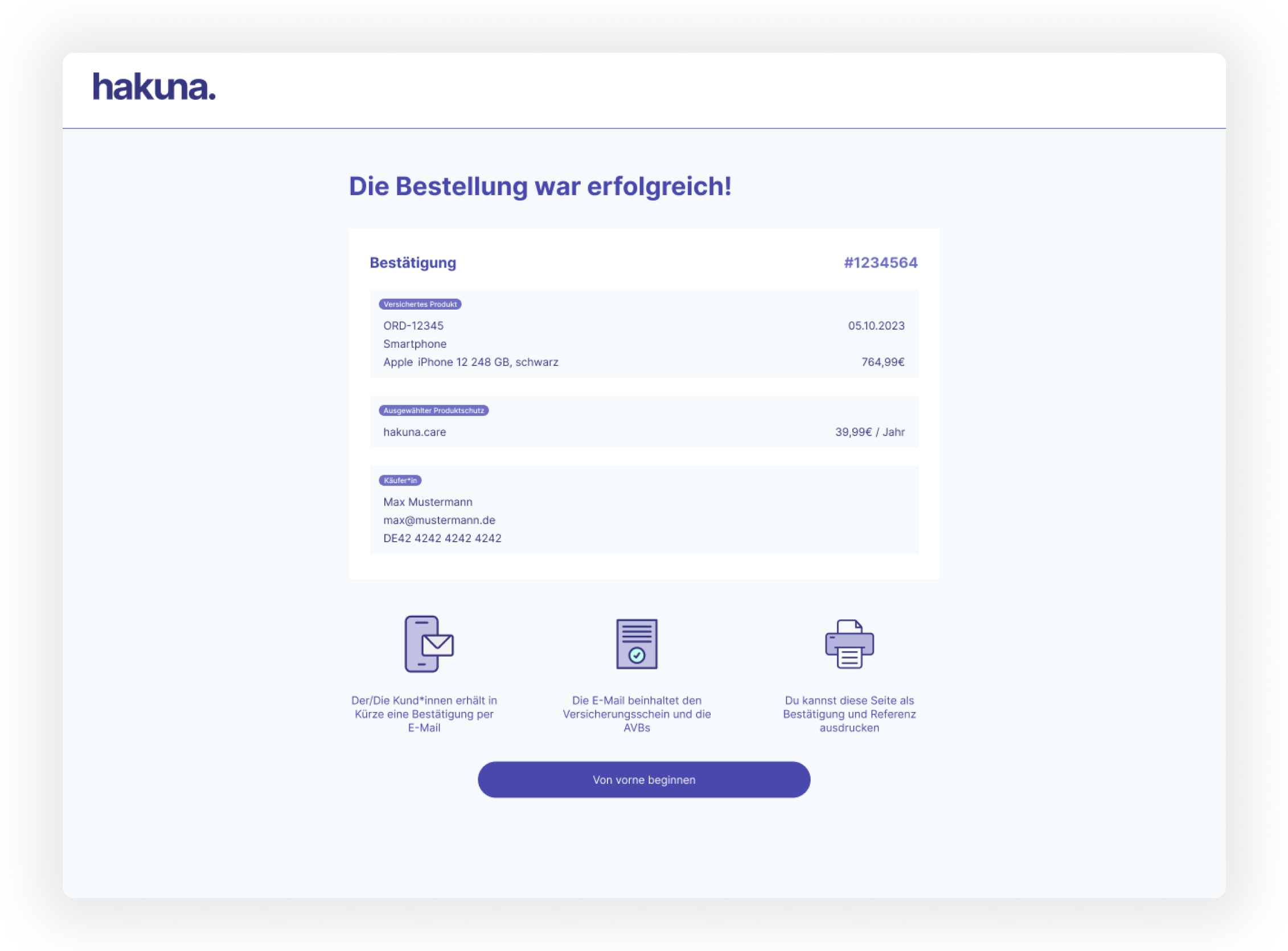 Glückwunsch, du hast soeben deinen ersten Produktschutz mit Hakuna Assist verkauft! Um eine neue Transaktion zu starten, klicke einfach auf "Von vorne beginnen".