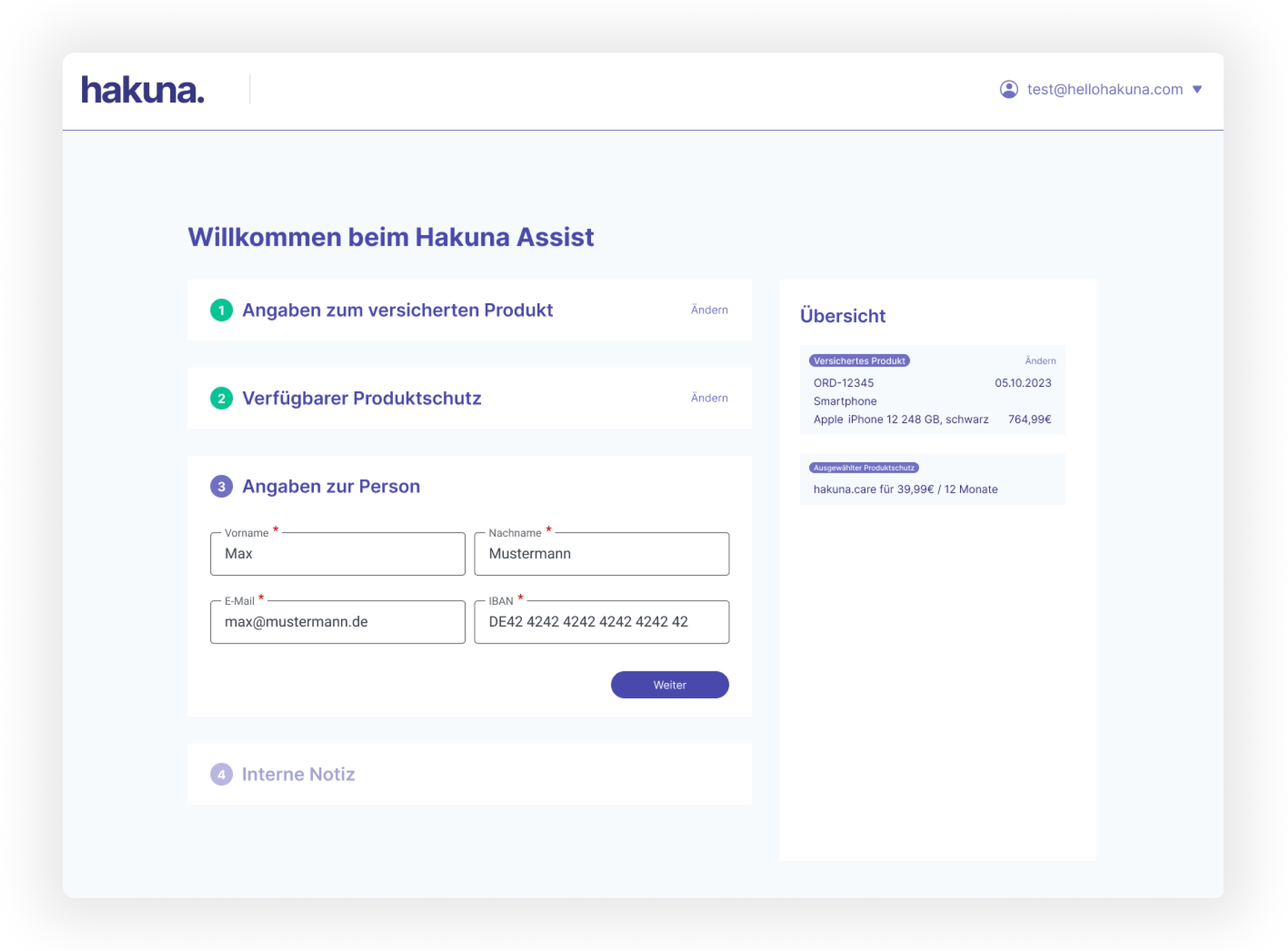 Hole die Erlaubnis des Kunden ein, dass Hakuna über SEPA abrechnen darf, erfasse die erforderlichen Kundendaten und klicke anschließend auf "Weiter", um zu Abschnitt 4 zu gelangen.