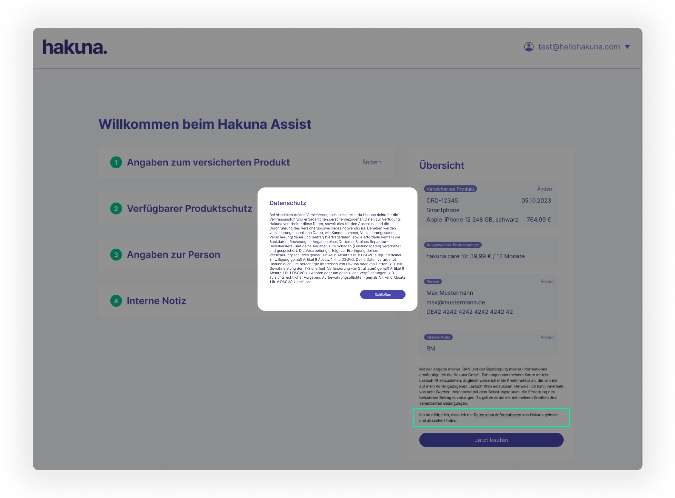 Öffne die Datenschutzinformationen, indem du auf den Link über der Schaltfläche "Jetzt kaufen" klickst, und lass den Kunden die Informationen lesen.